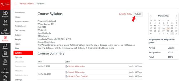 There are a number of ways to add your syllabus to a course in Canvas. You can add it as a Page and a File or you can use Canvas’ integrated syllabus feature. Click Syllabus in Course Navigation and then Edit. You can copy and paste your syllabus here, where your assignments will be listed automatically below.